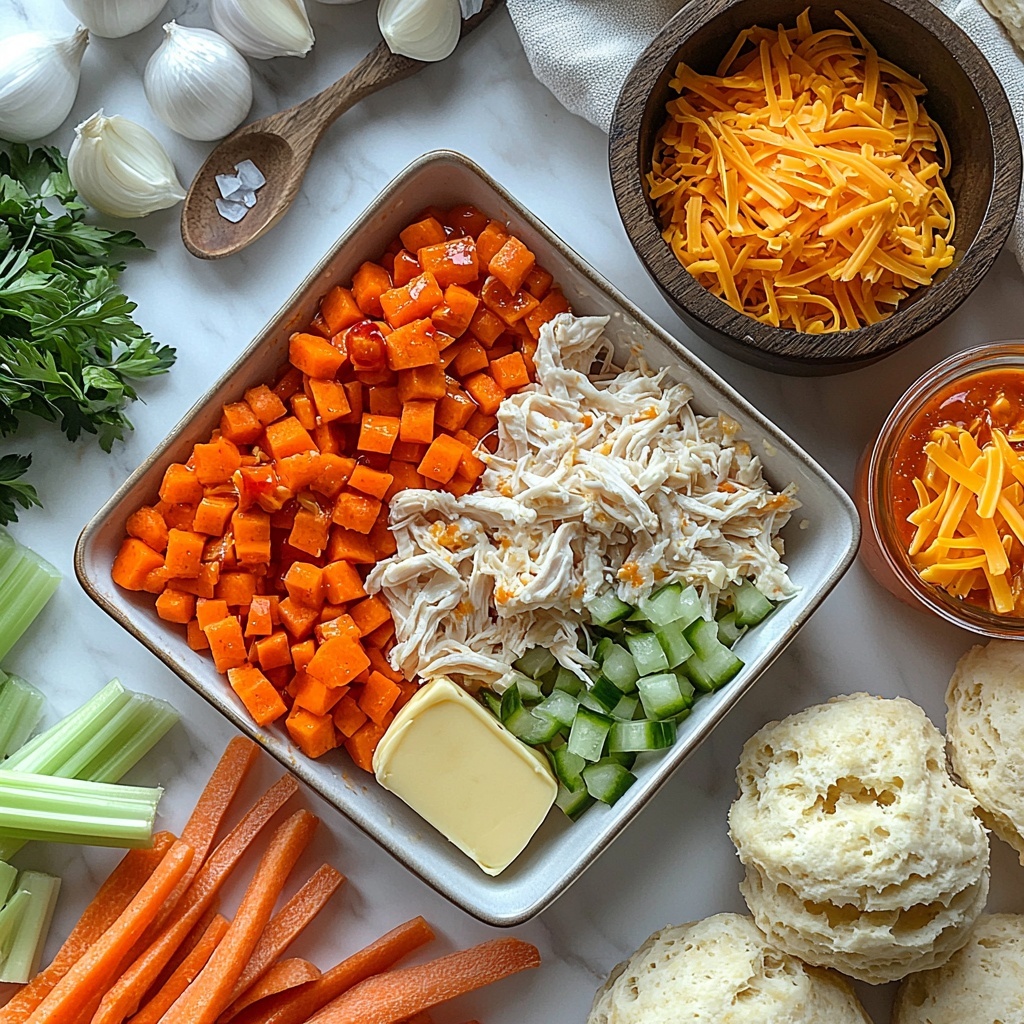 This Chicken Pot Pie with Buffalo Sauce Recipe comes together using ingredients that are simple yet indispensable, each playing a unique role in achieving the perfect balance of flavors and textures. From crisp fresh vegetables to velvety chicken broth and a cheeky punch of buffalo sauce, these components create a dish that’s hearty and exciting all at once.