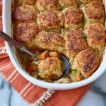 Reheat leftovers in a 350°F oven for 15 to 20 minutes, uncovered, so the biscuit topping stays crisp instead of getting soggy. Microwaving works too, but it won’t preserve that beautiful biscuit crust as well.