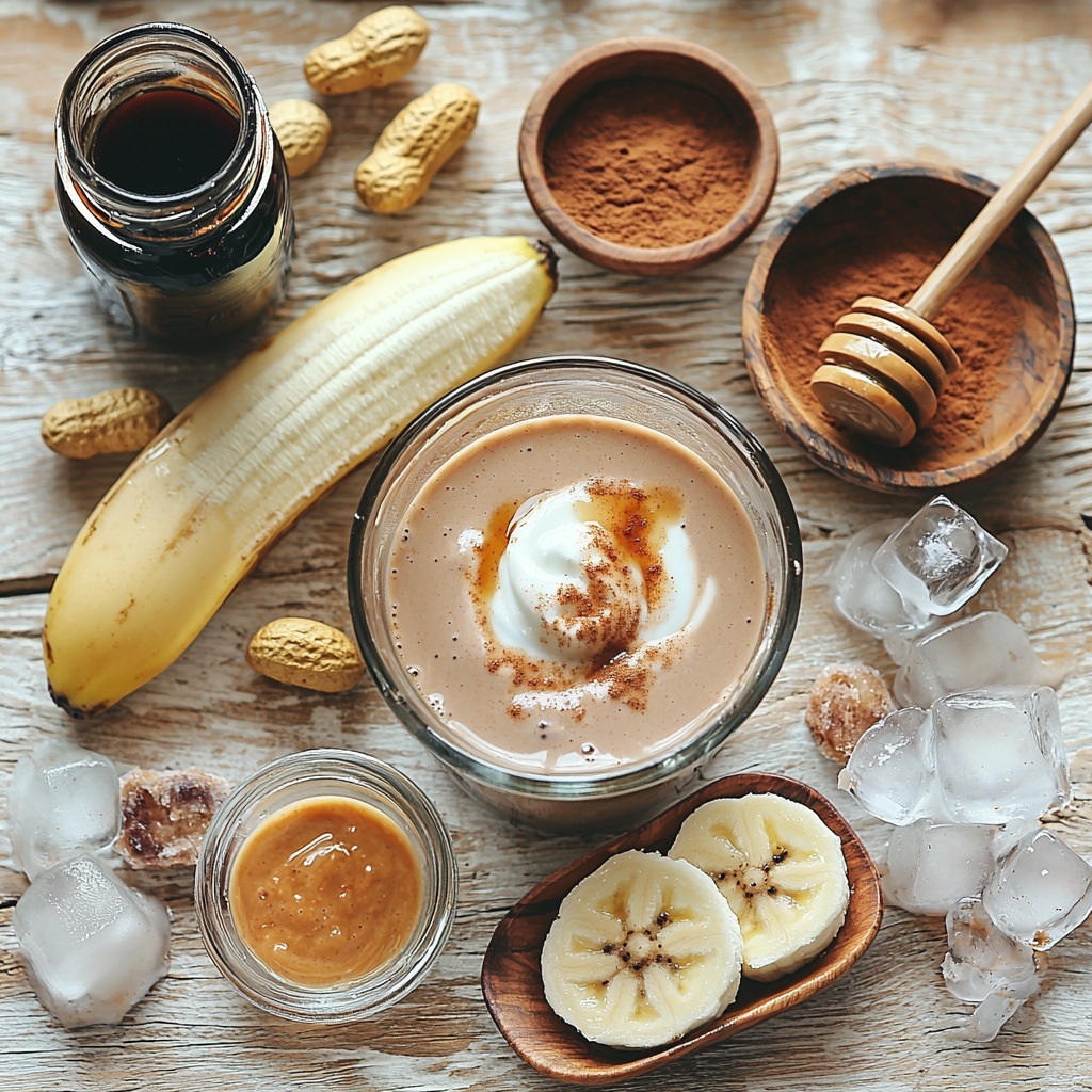 - Combine Ingredients: Add the chilled coffee, milk, Greek yogurt, frozen banana, nut butter, honey or maple syrup, vanilla extract, cinnamon, and ice cubes to a blender.