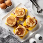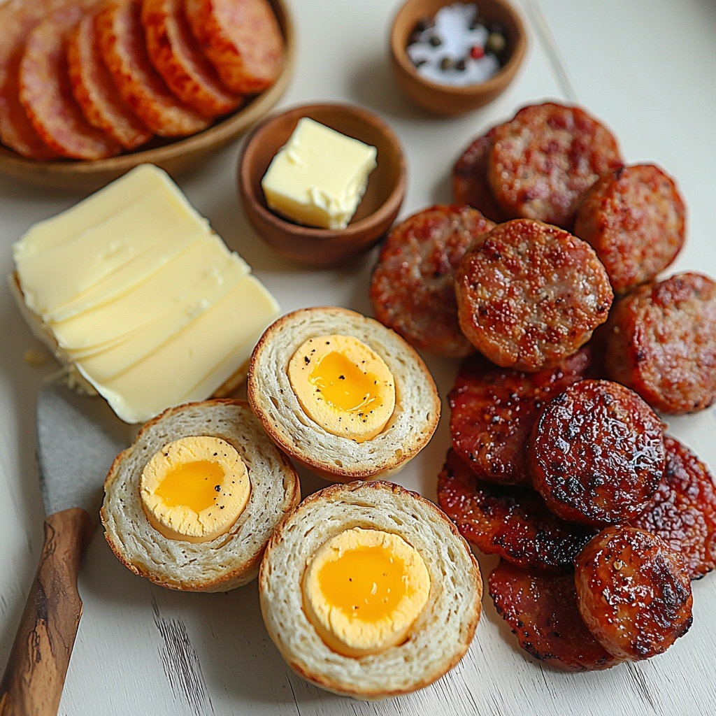 - Assemble the Sandwiches: Place the bottom halves of the English muffins on a clean surface. Add a slice of cheese to each muffin half. For three sandwiches, top each with a cooked egg and two halves of bacon. For the remaining three sandwiches, top each with a cooked egg and one sausage patty. Finally, cover each with the top half of the English muffin.