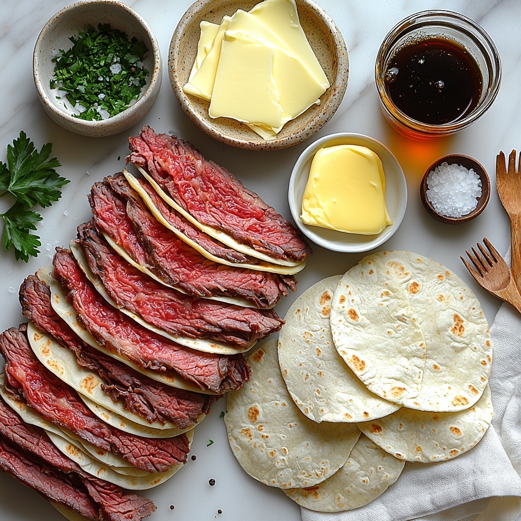 Lay your tortillas flat on a clean surface and distribute the thinly sliced roast beef evenly on each one, leaving a small border without filling for easier rolling. Next, layer the provolone cheese slices right on top of the beef. This combination is the heart of your French Dip Tortilla Rollups: Delicious Beef Bites Recipe, bringing together classic savory elements in every bite.