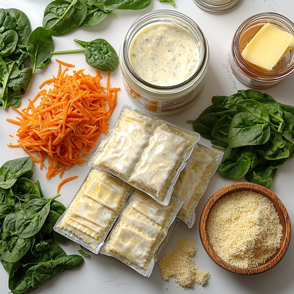 Sprinkle a generous handful of fresh spinach and shredded carrots on top of your ravioli layer. This adds fresh flavor, texture, and a vibrant burst of color that brightens every bite.