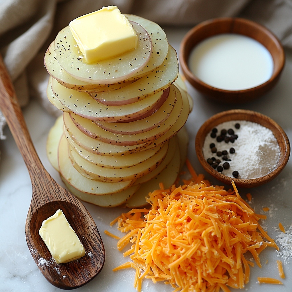 The beauty of this Potatoes au Gratin Recipe lies in its simplicity. Each ingredient plays a crucial role in building that velvety sauce and tender potato layers that make the dish so memorable. From the earthy russet potatoes to the sharp Cheddar cheese, every component adds depth and comfort to the final bake.