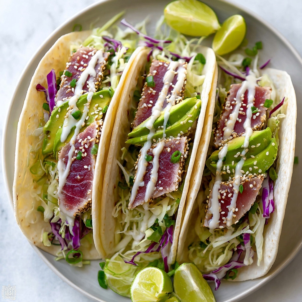 Now for the fun part: layering. Start with a bed of the lime-kissed cabbage slaw on each tortilla, add a few slices of creamy avocado, then top with several slices of seared ahi tuna. Drizzle your creamy sauce over the top and finish with a sprinkle of fresh cilantro to brighten the flavors. Serve immediately for the best texture and temperature balance.