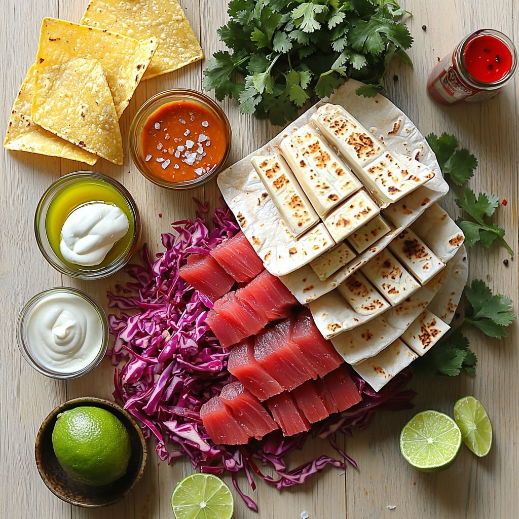 In a bowl, toss the shredded red cabbage with fresh lime juice until it’s evenly coated. This simple slaw adds a zesty crunch that contrasts beautifully with the silky tuna. In a separate bowl, mix sour cream or Greek yogurt with hot sauce if you want an added spicy kick. This sauce will bring creamy, tangy elements to your tacos.