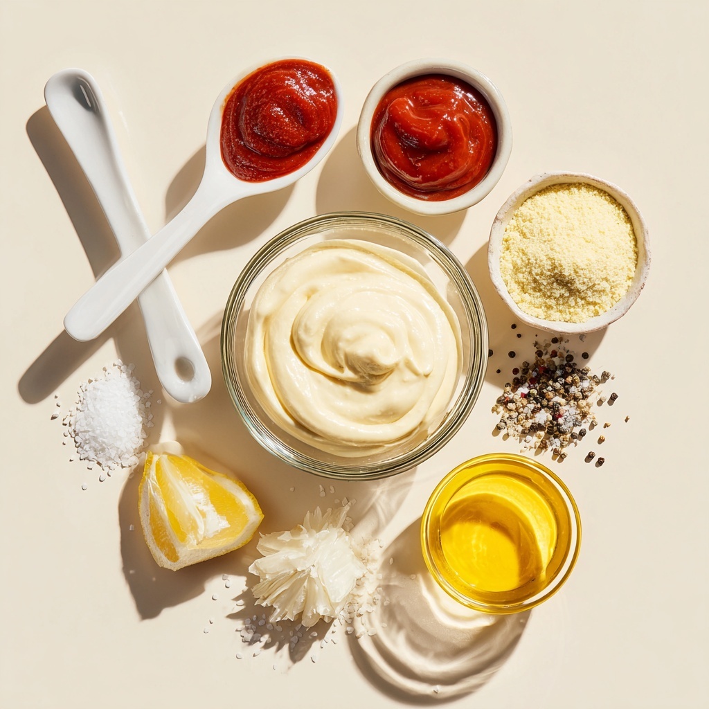 The magic of this Spicy Garlic Sriracha Aioli Recipe lies in its simplicity. Each ingredient plays a crucial role—from providing creaminess and tang to delivering that fiery kick and aromatic depth. You won’t need a pantry full of fancy supplies, just a few essentials that pack a serious flavor punch.