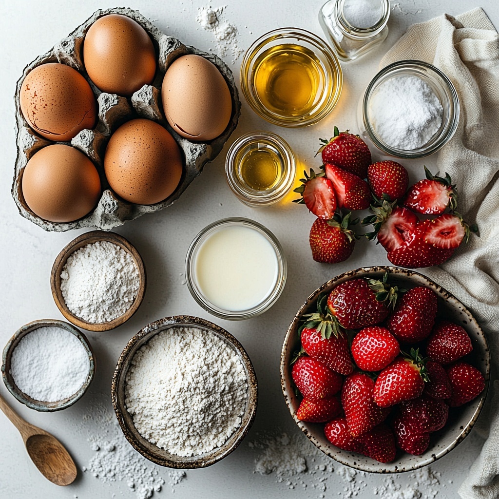 To create this show-stopping Strawberry Cream Cake Recipe, you only need a handful of straightforward ingredients that work together like magic. Each item plays a crucial role, from the airy cake layers to the velvety cream and juicy strawberry bursts that make this dessert unforgettable.
